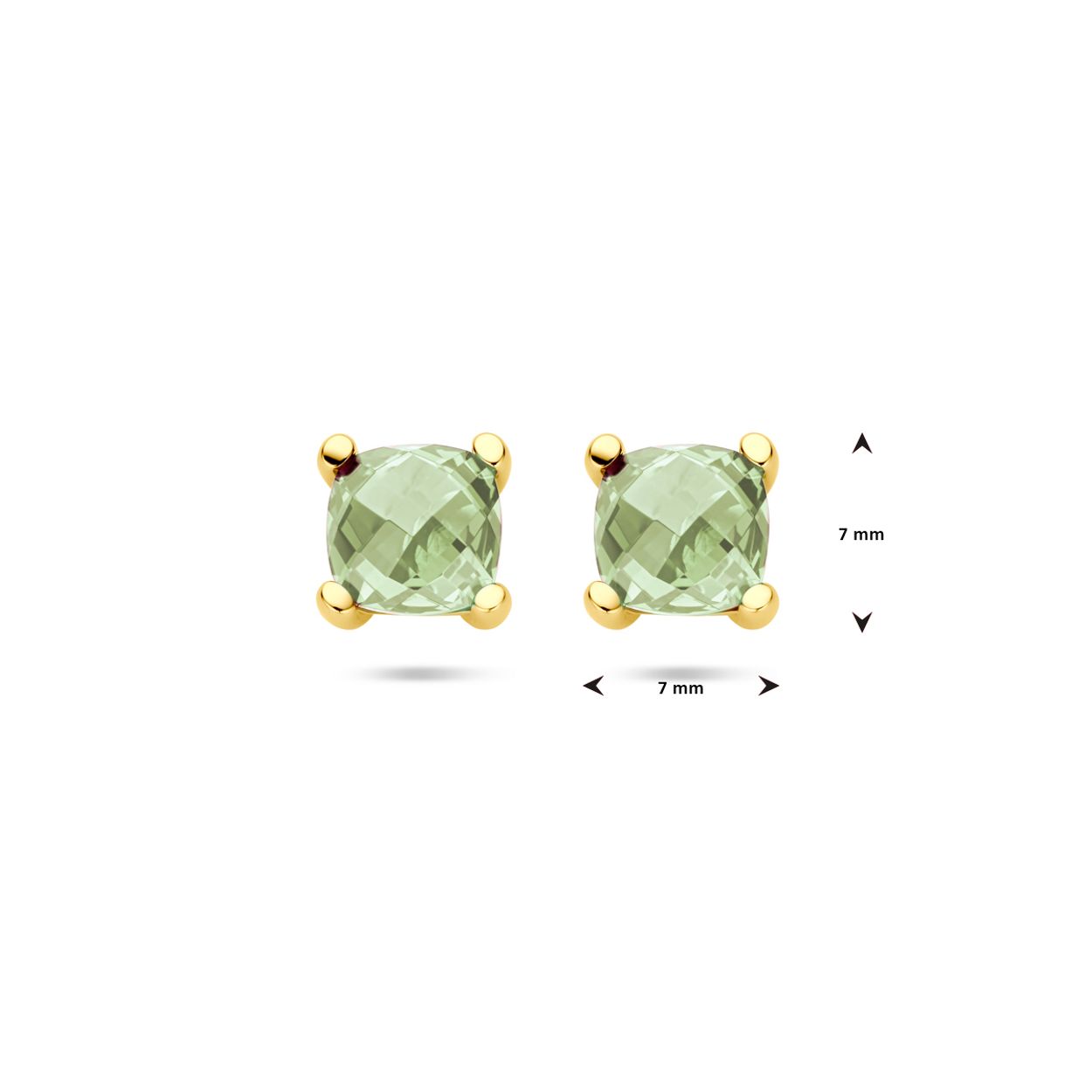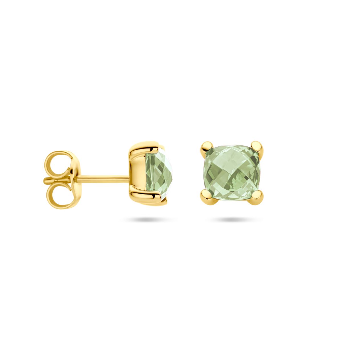 14krt Geelgouden oorknoppen uitgevoerd met groen amethist. De oorknoppen hebben een afmeting van 7x7mm.