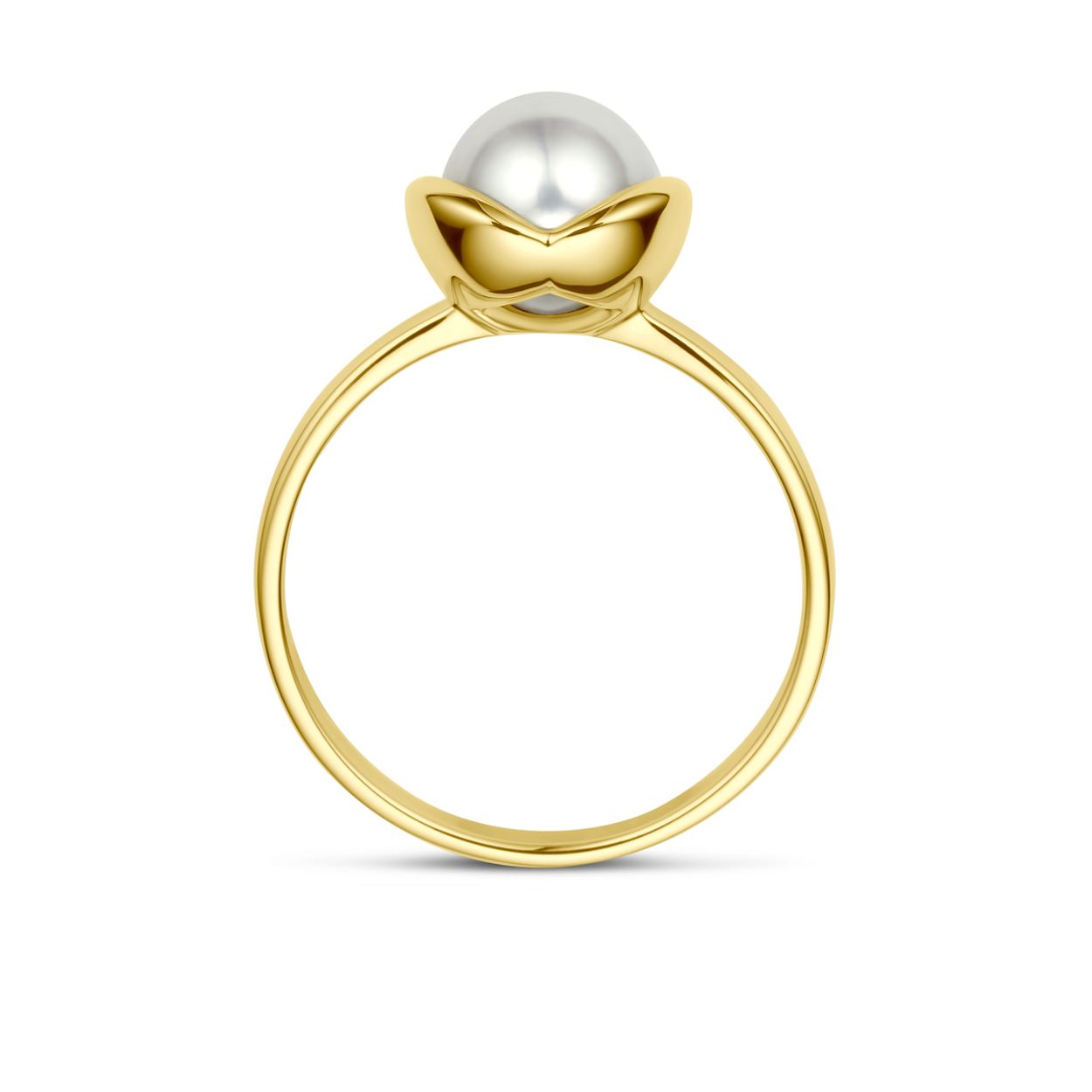 14krt Geelgouden ring uitgevoerd met een zoetwaterparel. De ring heeft een afmeting van 9x10mm.