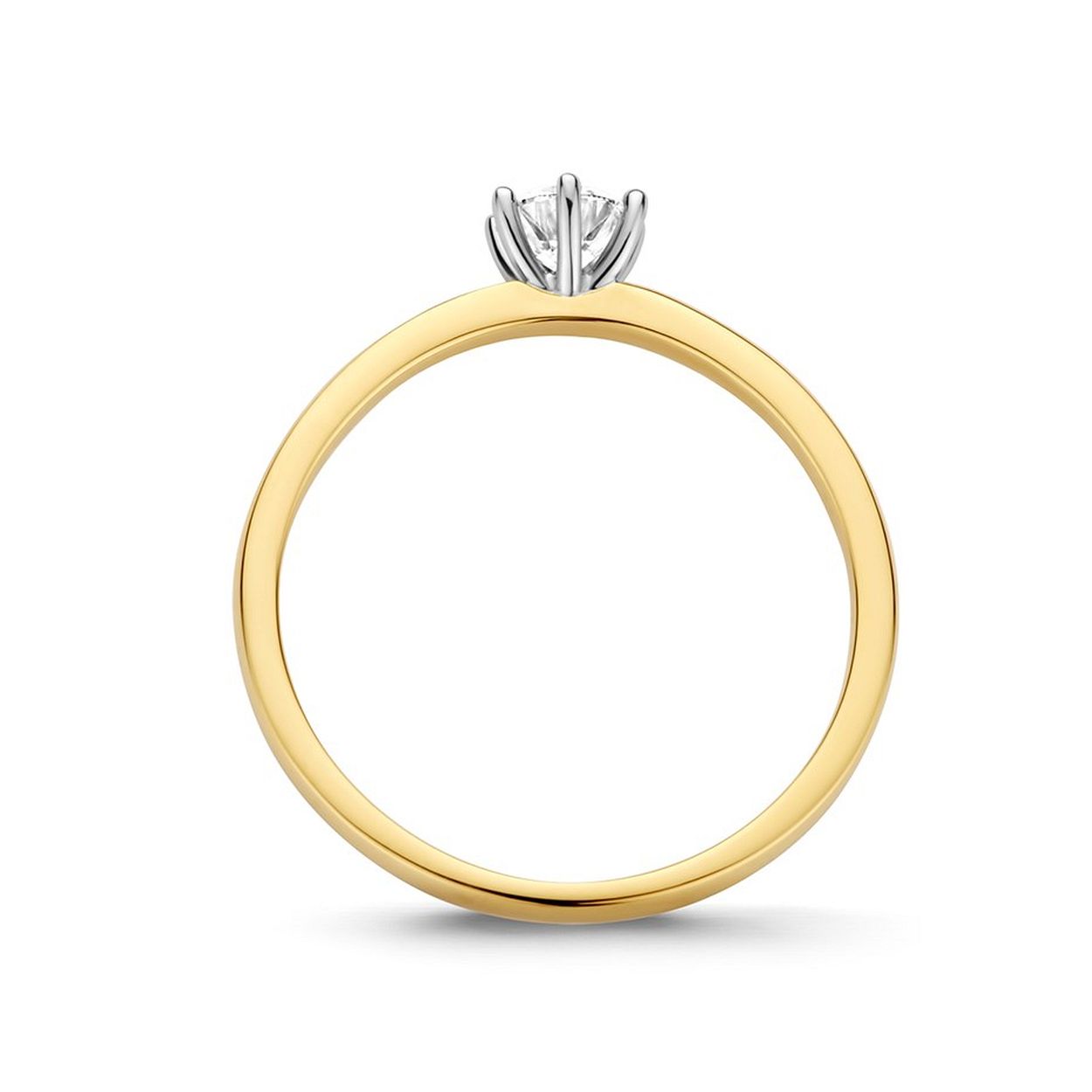 14k Bicolor geel- en witgouden ring uitgevoerd met een schitterende diamant. De ring heeft een breedte van 5.2mm.