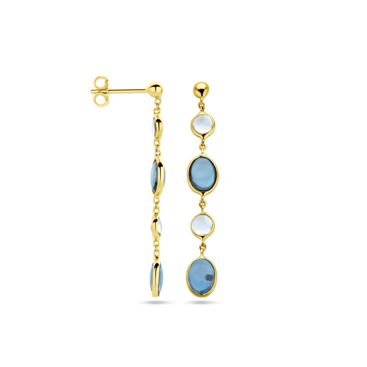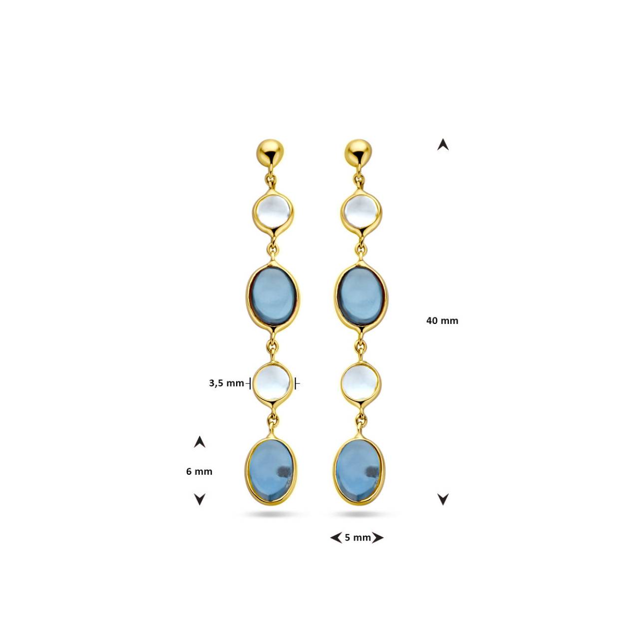 14krt Geelgouden oorhangers uitgevoerd met london blue en blauw topaas. De oorhangers hebben een totale hoogte van 40mm.