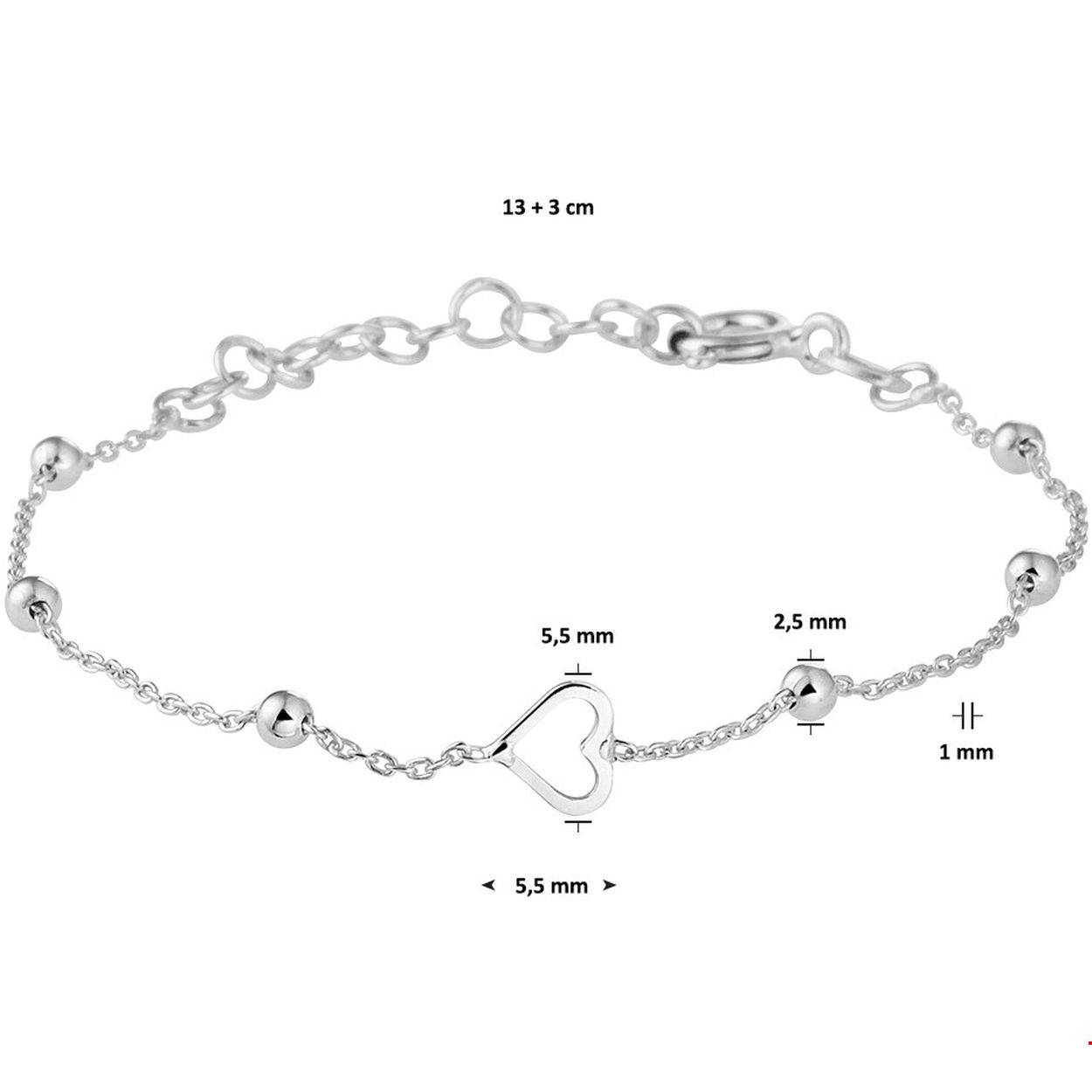 Beschrijving: Schattig fijn gerhodineerd zilveren armband met in het midden een open hart met een afmeting van 5.5x5.5mm en poli afgewerkte bolletjes van 2.5mm. De armband heeft een draaglengte van 13cm en een extensie van 3cm. Totale lengte is 16cm.
