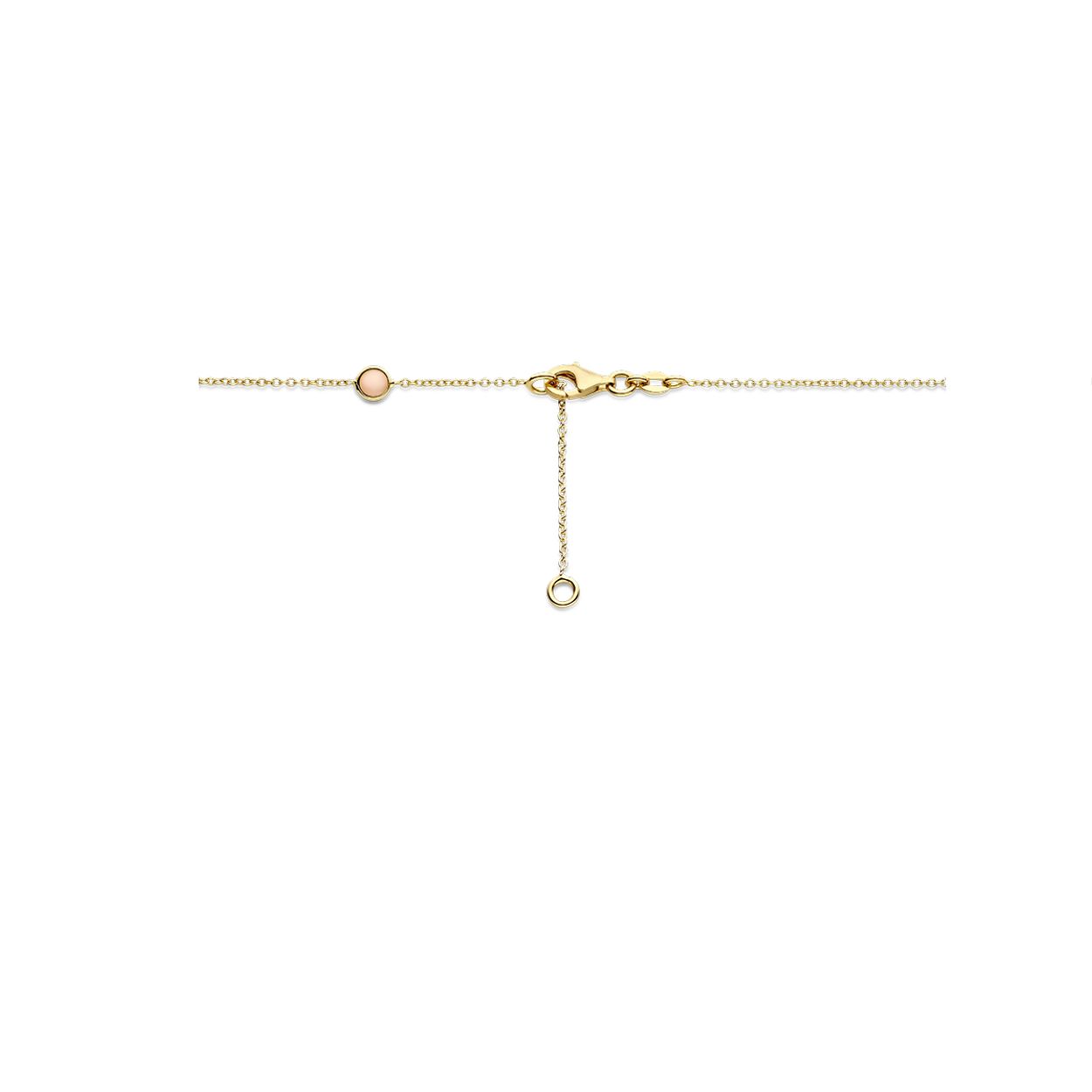 14k Geelgouden collier uitgevoerd met roze robijn en roze opaal. De draaglengtes van de collier zijn 42 en 45cm. De breedtes van de stenen met zetkast is 6.5 en 4.5mm.