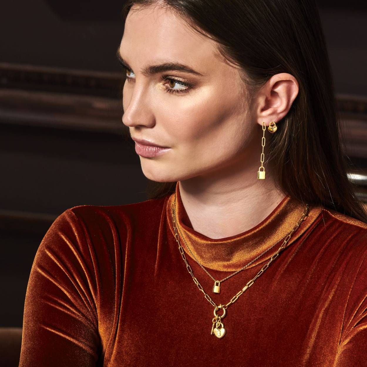 Geelgoud op 925 zilveren anker collier uitgevoerd met een hanger in de vorm van een slotje. Geen garantie op plating.