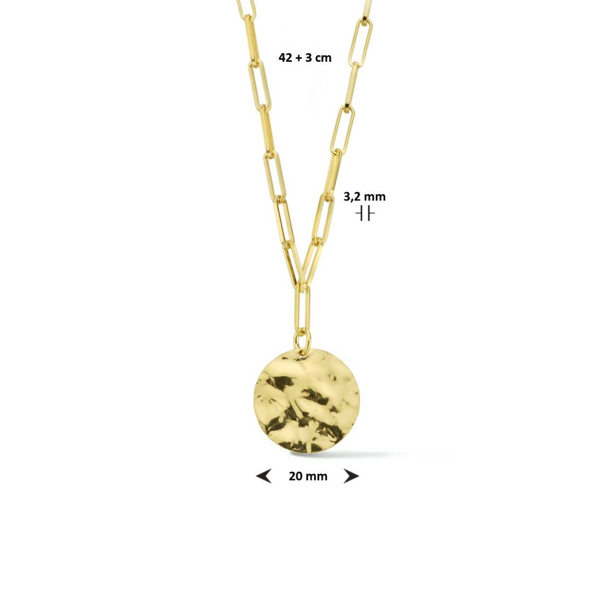 Geelgoud op 925 zilveren anker collier uitgevoerd met een ronde hanger. Het collier heeft een draaglengte van 42cm met een extensie van 3cm. Geen garantie op plating.