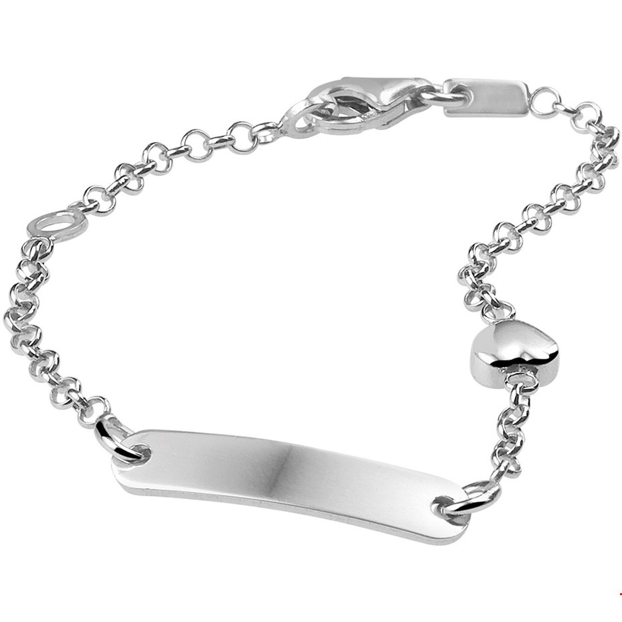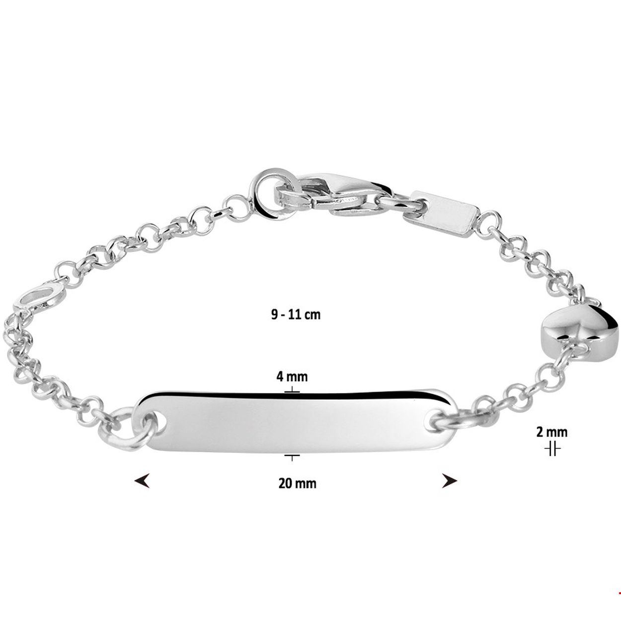 Beschrijving: Gerhodineerd zilveren graveerarmband uitgevoerd met een hartje van 5.5x5mm en een karabijn sluiting. De graveerarmband heeft draaglengtes van 9 en 11cm.