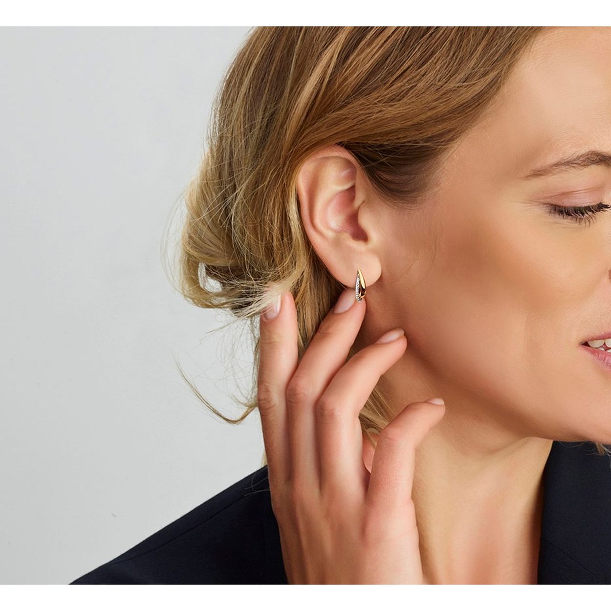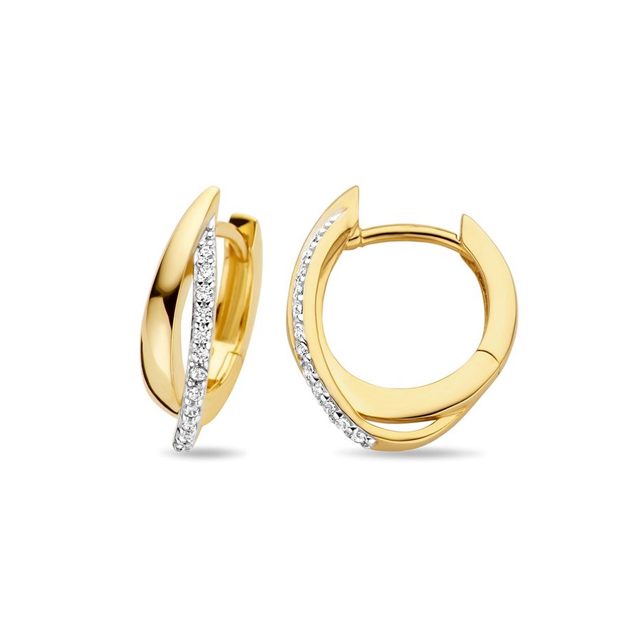14k Geelgouden klapoorringen uitgevoerd met een schitterende zirkonia rij. De oorringen zijn bicolor gestift en hebben een afmeting van 16x4.5mm.
