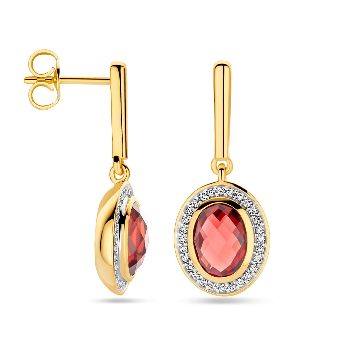 14k Geelgouden oorhangers uitgevoerd met granaat en diamant. De oorhangers hebben een totale hoogte van 26mm. Uitgevoerd met karabijnsluiting.
