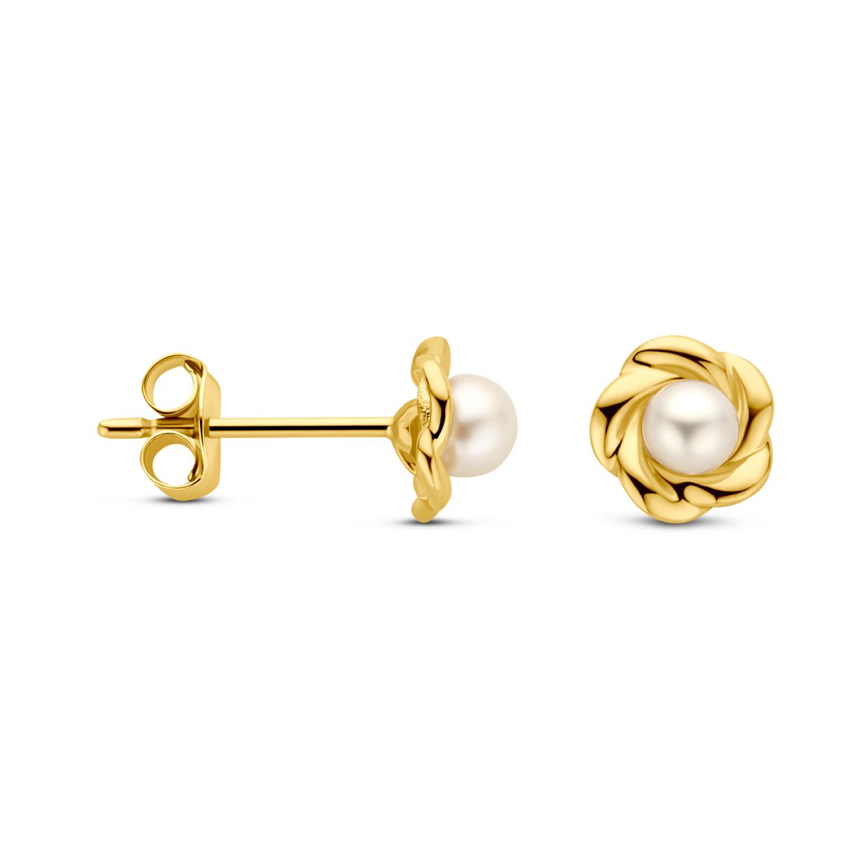 14k Geelgouden oorknoppen uitgevoerd in de vorm van een bloemetje met een zoetwaterparel van 3 mm. De oorknoppen hebben een diameter van 6 mm.