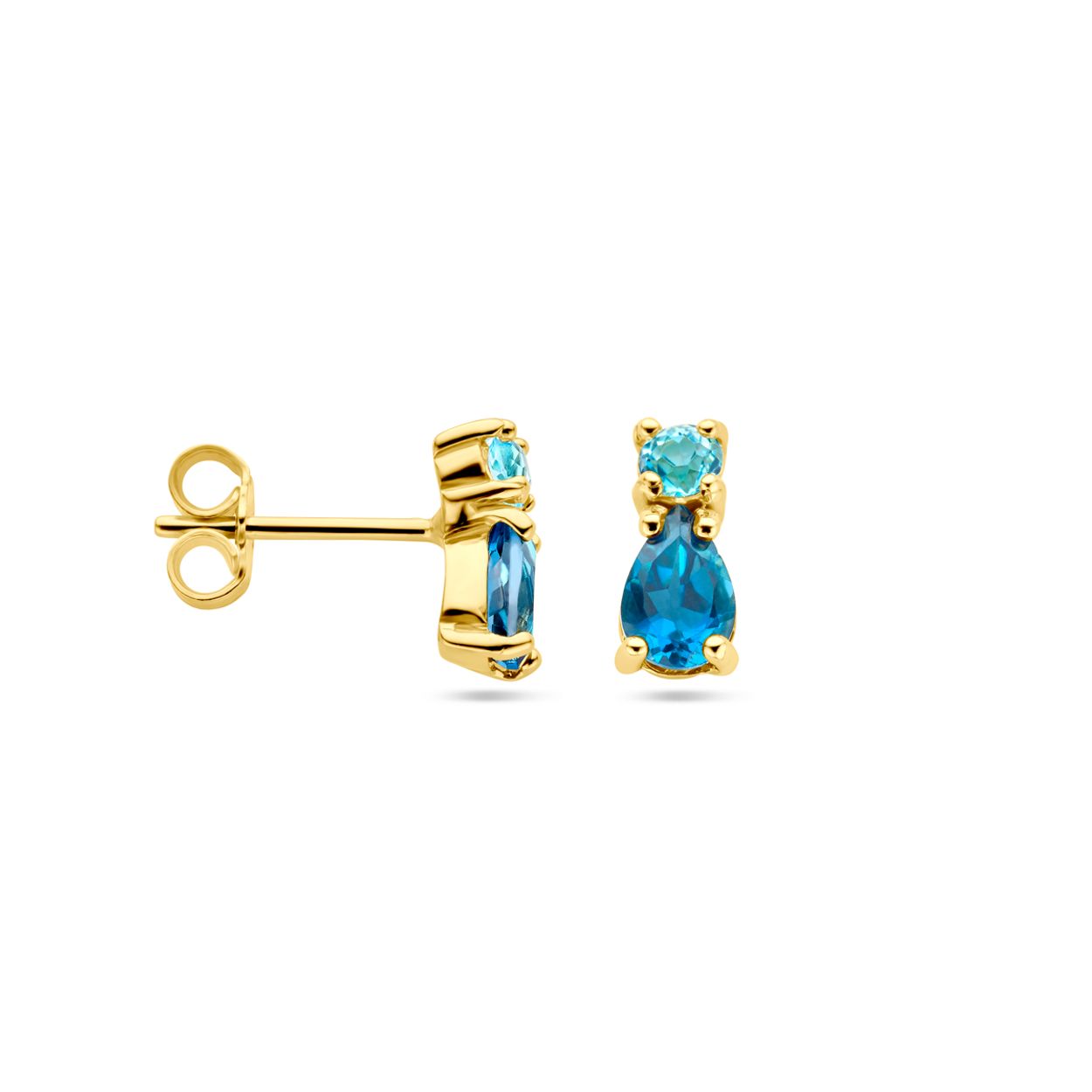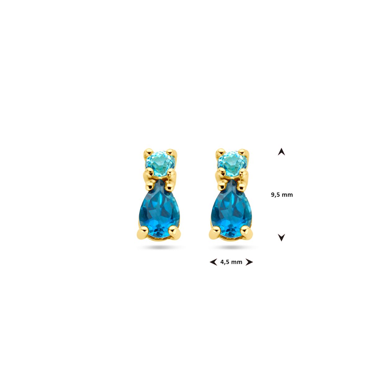 14krt Geelgouden oorknoppen uitgevoerd met london blue topaas en sky blue topaas. De oorknoppen hebben een afmeting van 9,5x4,5mm.