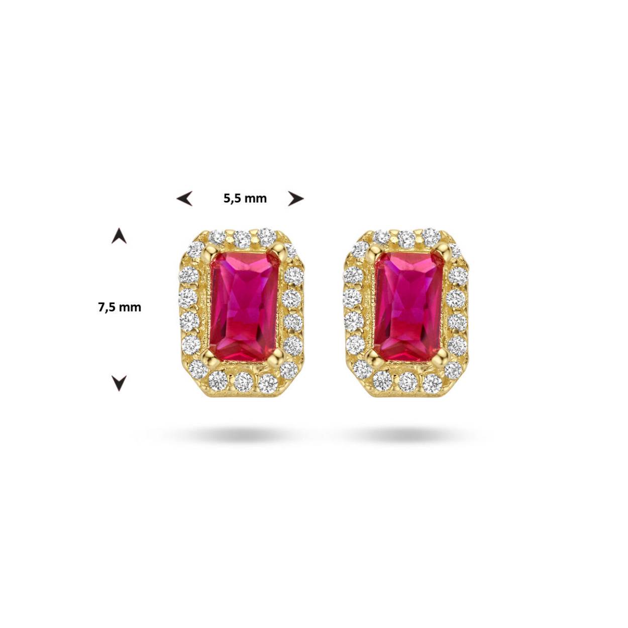 14k Geelgouden oorknoppen uitgevoerd met schitterende rode zirkonia. De oorknoppen hebben een afmeting van maat 7.5x5.5mm.