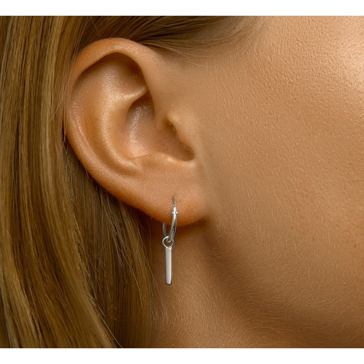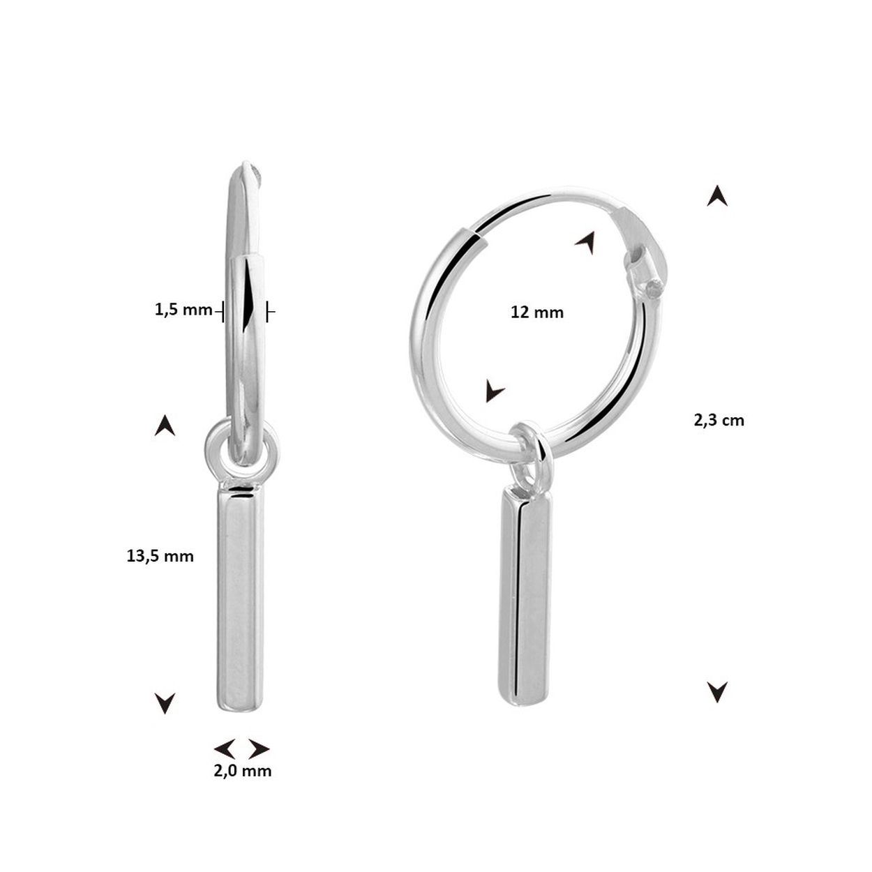 Gerhodineerd 925 zilveren oorringen uitgevoerd met een hanger in de vorm van een balkje. De oorringen hebben een dikte van 1.5mm en een diameter van 12mm. Het balkje heeft een afmeting van 13.5x2mm.