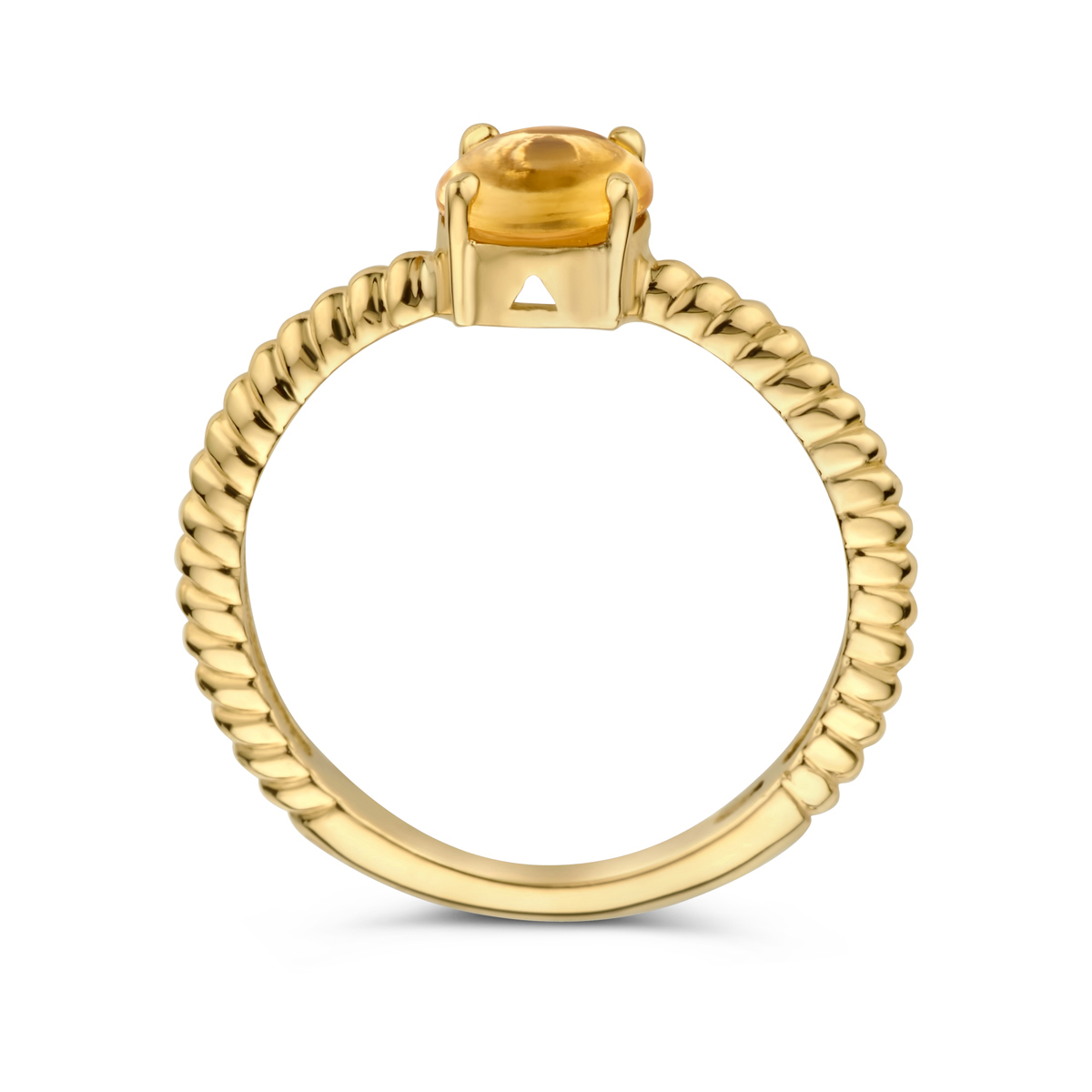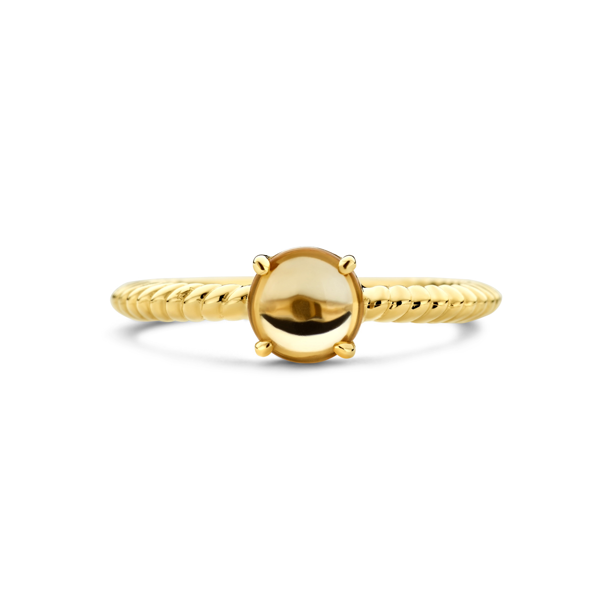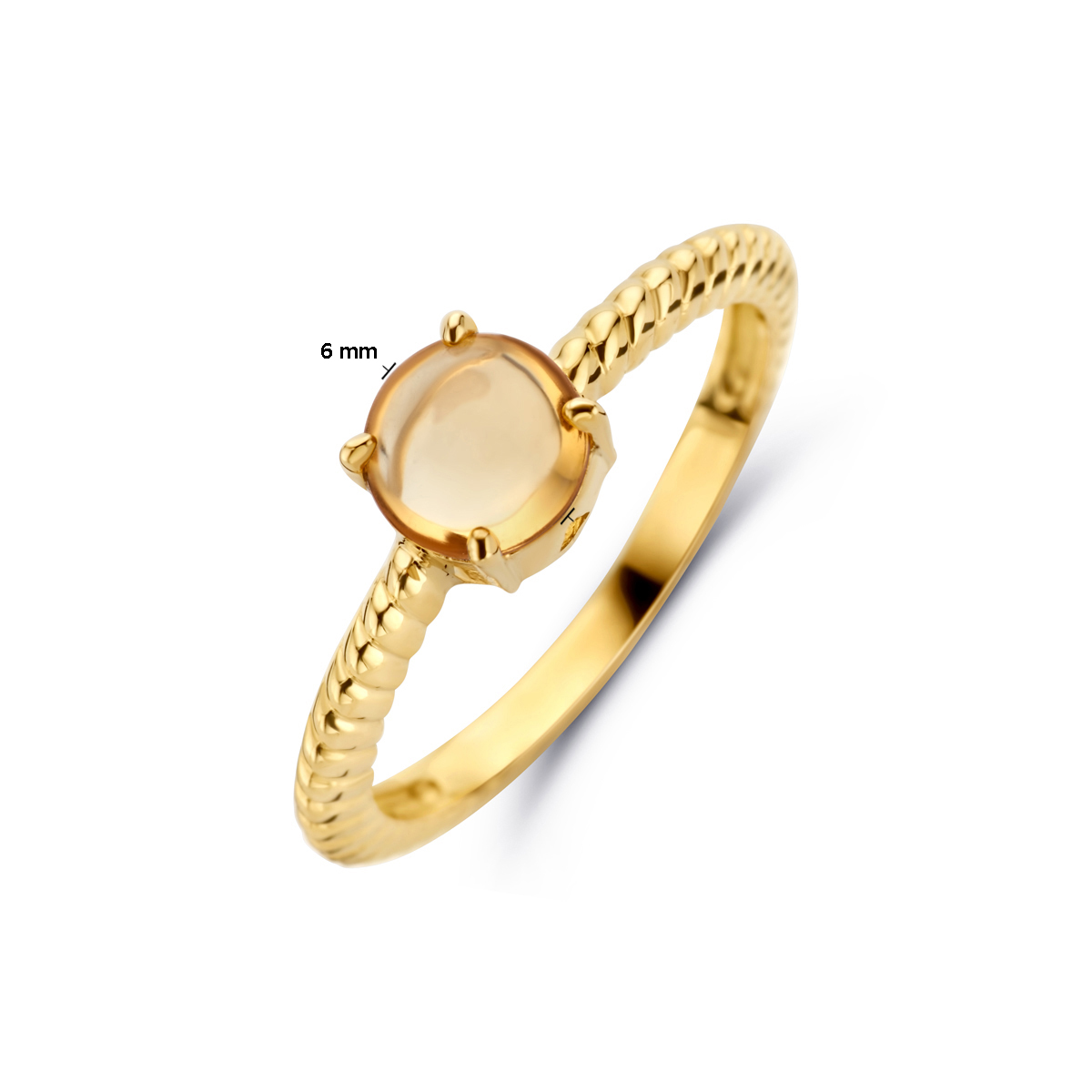 14k Geelgouden ring uitgevoerd met citrien. De steen heeft een diameter van 6mm. Het steengewicht is 0.75crt.