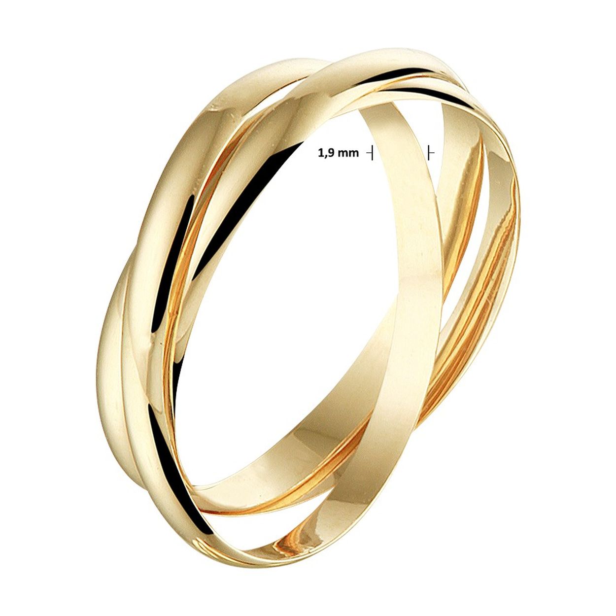 14k Geelgouden ring bestaande uit 3 in elkaar geplaatste losse ringen. De losse ringen hebben elk een breedte van 1.9mm.