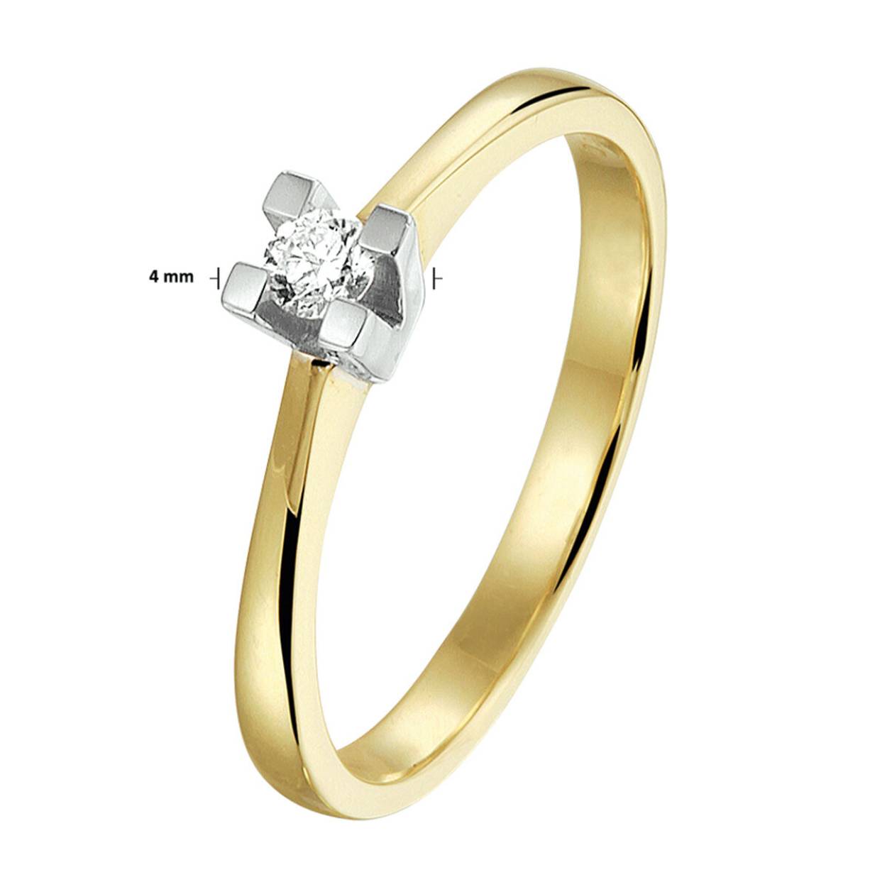 Beschrijving: Luxe bicolor geel- en witgouden ring met een breedte van 4mm uitgevoerd met een briljant geslepen diamant van 0.10ct. Tip: Perfect kado voor dierbare of geliefde! Diamonds are girls best friend!