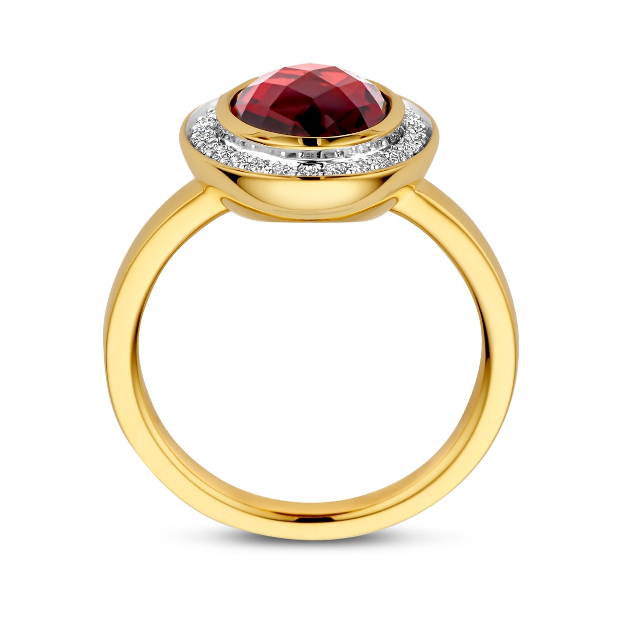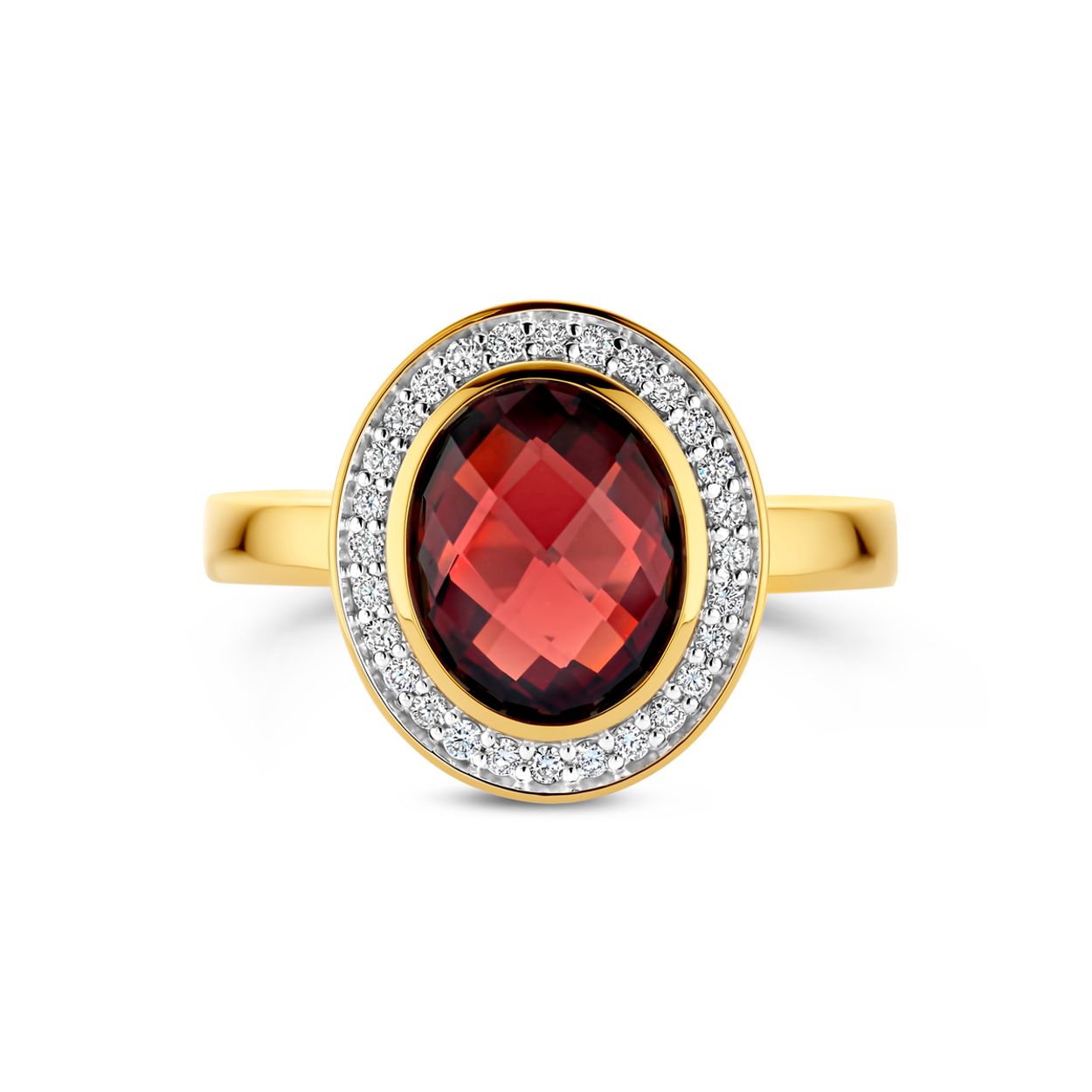 14k Geelgouden ring uitgevoerd met granaat en diamant. De ring heeft een afmeting van 15x13mm. De totale diamantgewicht is 0.18ct.