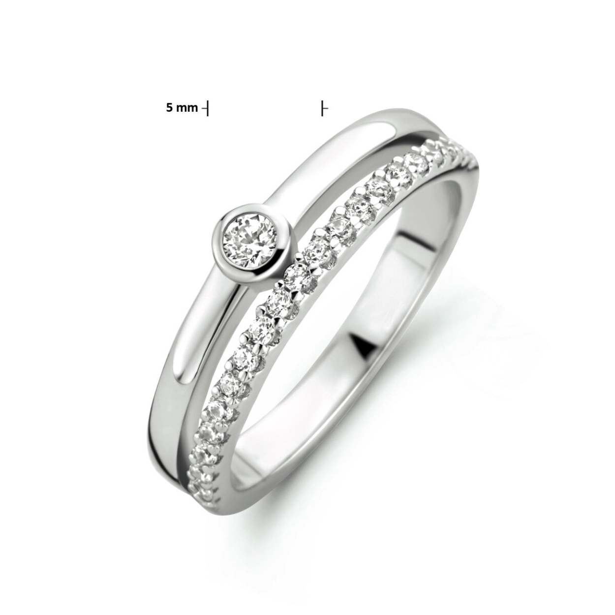 Gerhodineerd 925 zilveren ring uitgevoerd met schitterend zirkonia. De ring heeft een breedte van 5mm.
