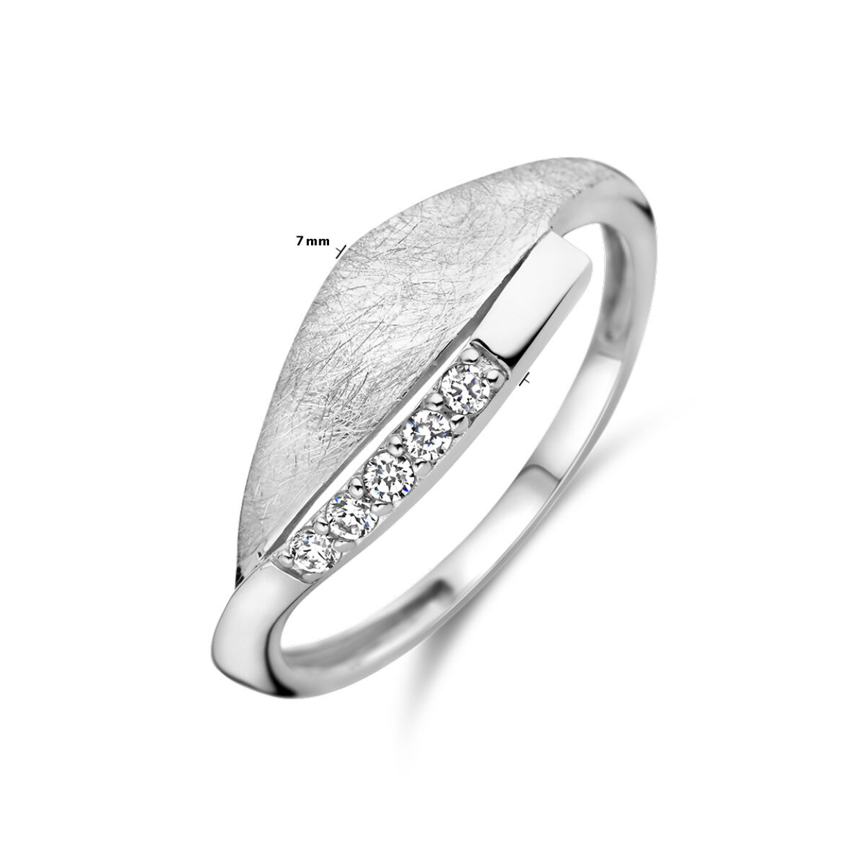 Gerhodineerd 925 zilveren ring uitgevoerd met zirkonia. De ring heeft een breedte van 7mm.