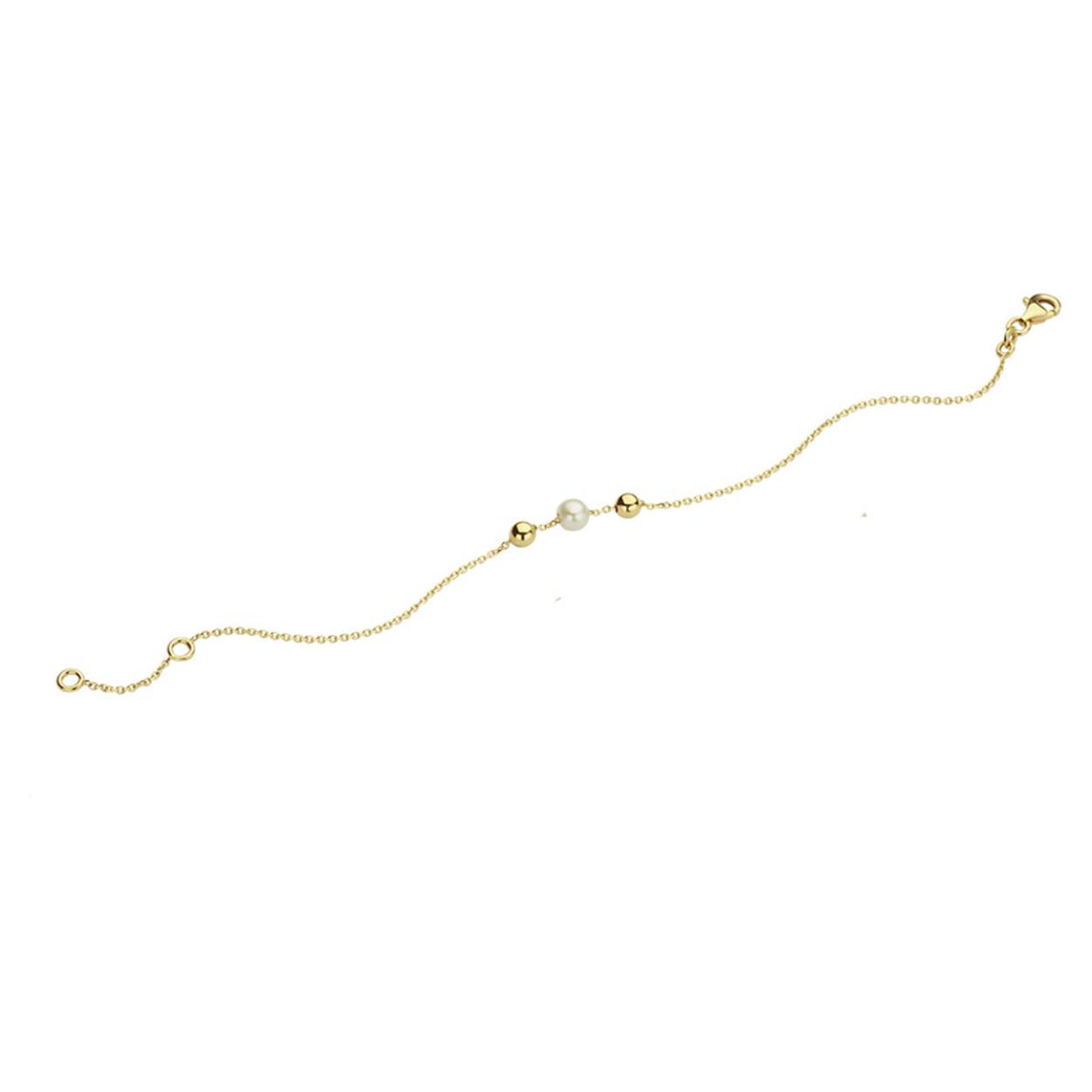 Stijlvolle geelgouden anker armband uitgevoerd met poli afgewerkte bolletjes, een zoetwaterparel en een stevige karabijn sluiting. De armband heeft draaglengtes van 17 en 19cm en is goed te combineren met bijpassende parel sieraden uit onze collectie of vanuit je eigen stash!