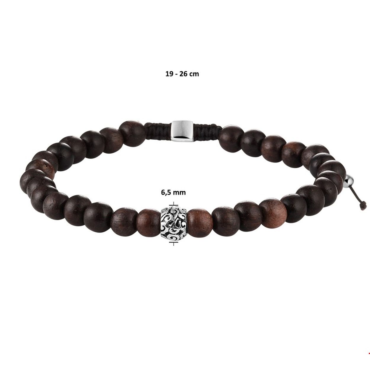 Beschrijving: Stoere armband uitgevoerd met donderbruin hout en zilveren elementen. De armband heeft een breedte van 6.5mm en een draaglengte van 19 tot 26cm. Tip: Leuk om kado te geven!