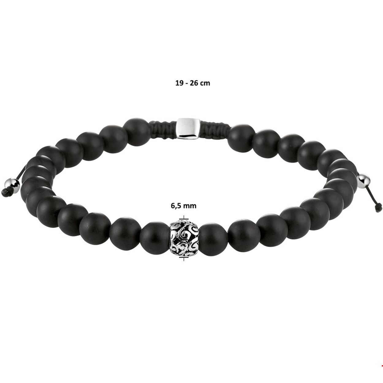 Beschrijving: Stoere armband uitgevoerd met mat afgewerkte onyx stenen en zilveren elementen. De armband heeft een breedte van 6.5mm en een draaglengte van 19 tot 26cm. Tip: Leuk om kado te geven!