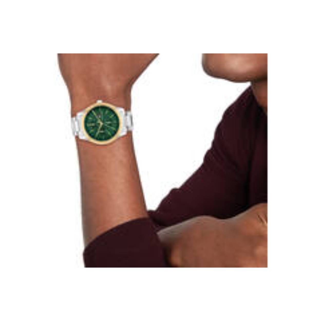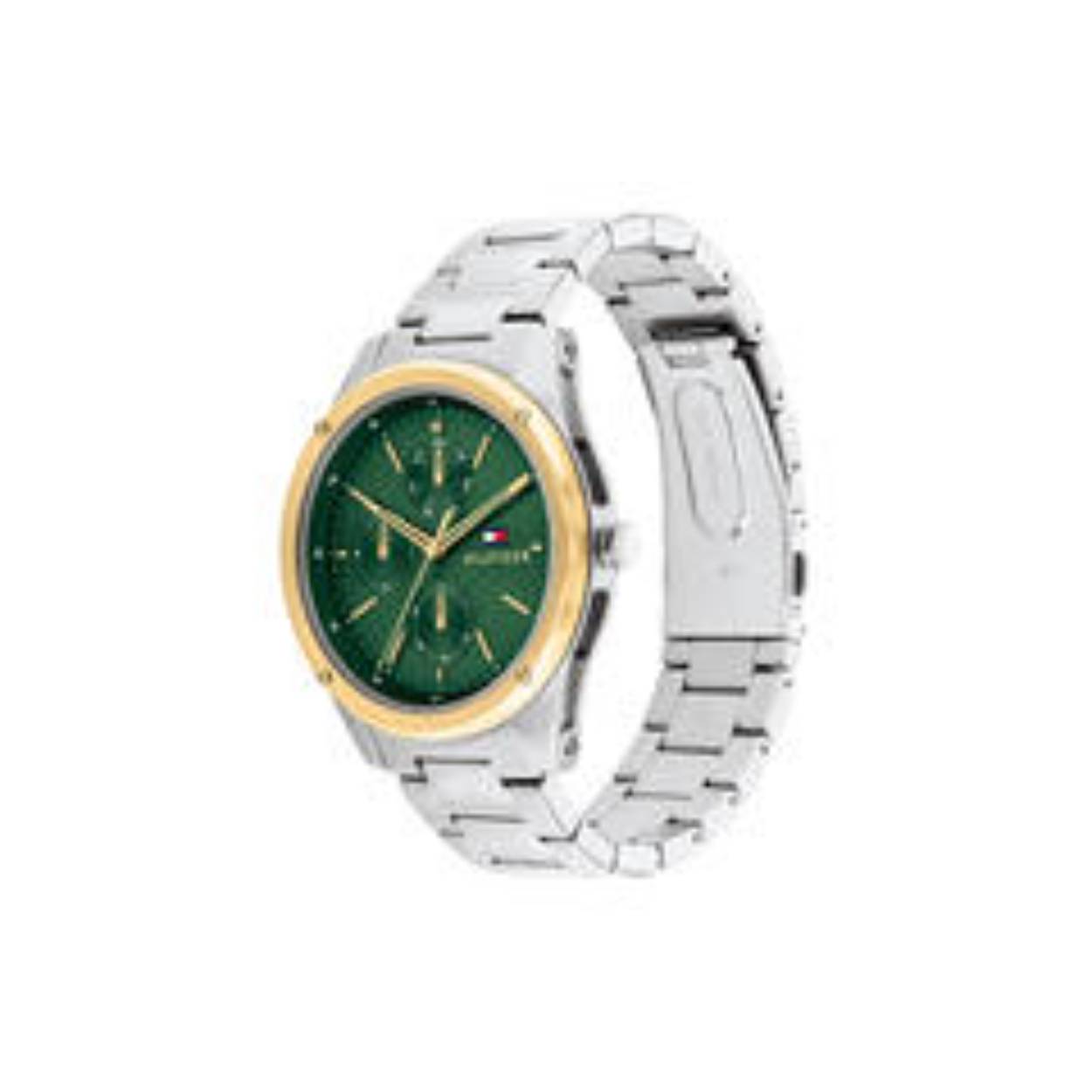 Dit specifieke horloge van Tommy Hilfiger met artikelnr: TH1710537 is een casual herenhorloge die zeker in je collectie past. Het stalen herenhorloge heeft een ronde zilverkleurige kast met een goudkleurige bezel met schroeven en een groene wijzerplaat met dag,- datum,- en 24-uurs aanduiding. Geïntegreerd aan de stijlvolle kast zit een zilverkleurige schakelband met een vouwsluiting. De band is op lengte verstelbaar. Het horloge heeft een mineraalglas, een doorsnee van 43mm en is 5 ATM.