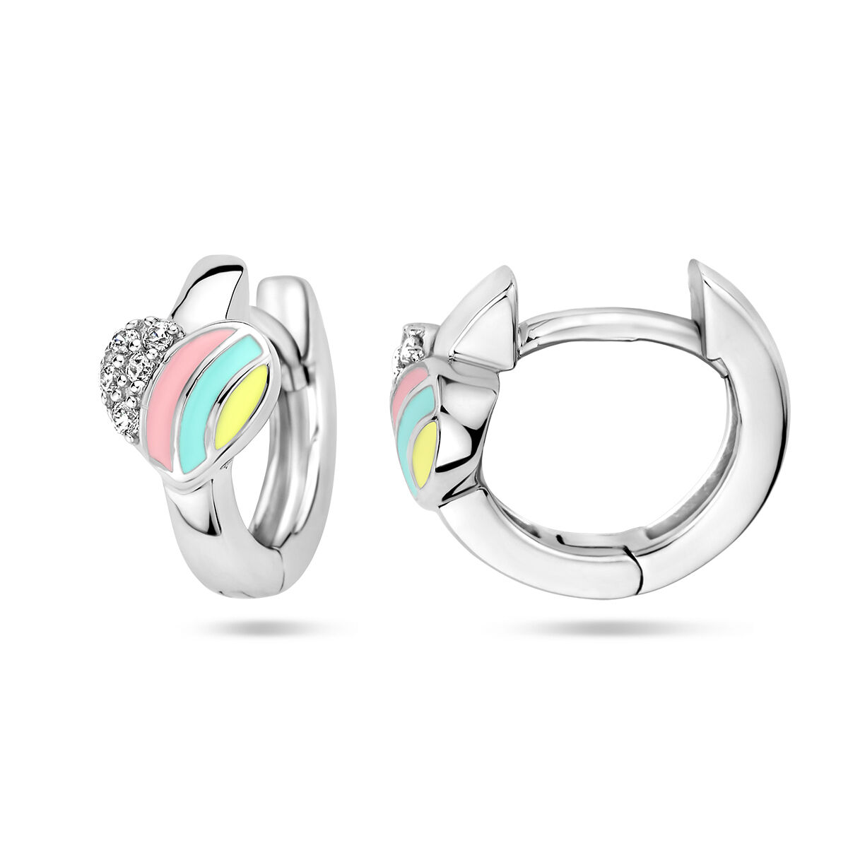 Gerhodineerd 925 zilveren klapoorringen met een hart en zirkonia. De oorringen hebben een diameter van 11mm.
