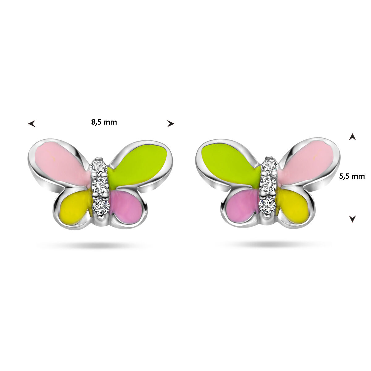 Gerhodineerd 925 zilveren oorknoppen in de vorm van een vlinder met zirkonia. De oorknoppen hebben een afmeting van 5.5x8.5mm.