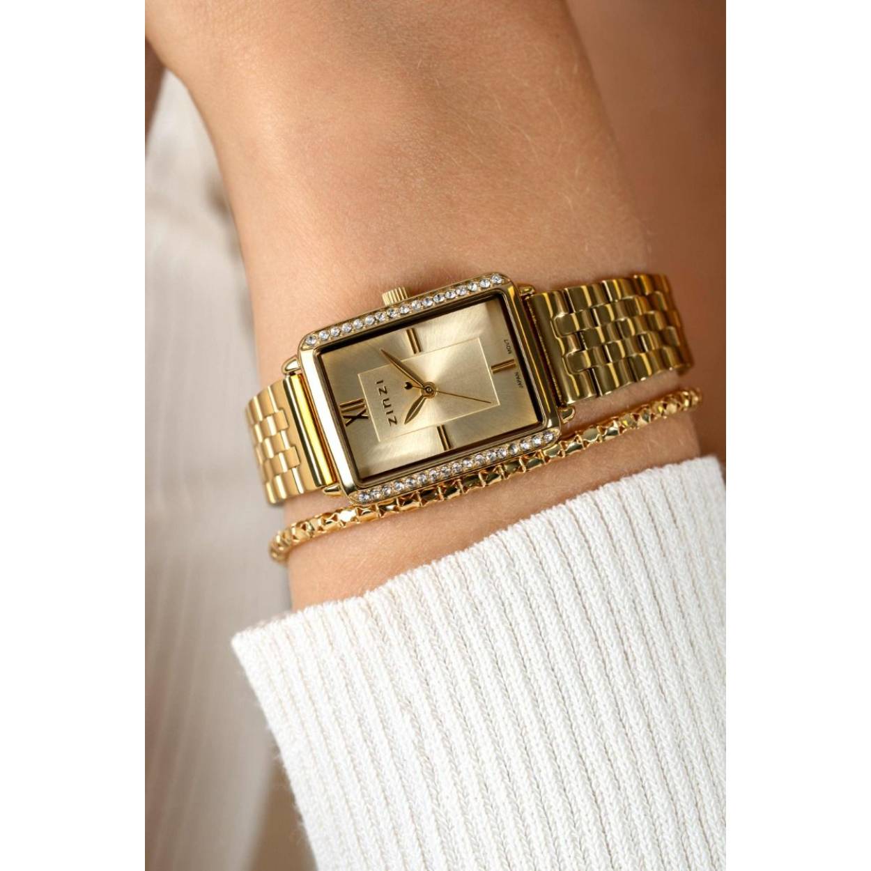 Het ZINZI Lucia horloge heeft een elegant rechthoekig ontwerp, waarbij aan de zijkanten een schitterende rij white crystals is gezet. Met zijn geheel stalen kast van 28 x 22mm en de prachtige stalen band oogt dit horloge elegant op iedere pols. Voorzien van een goudkleurige wijzerplaat en stalen schakelband in de kleur goud.